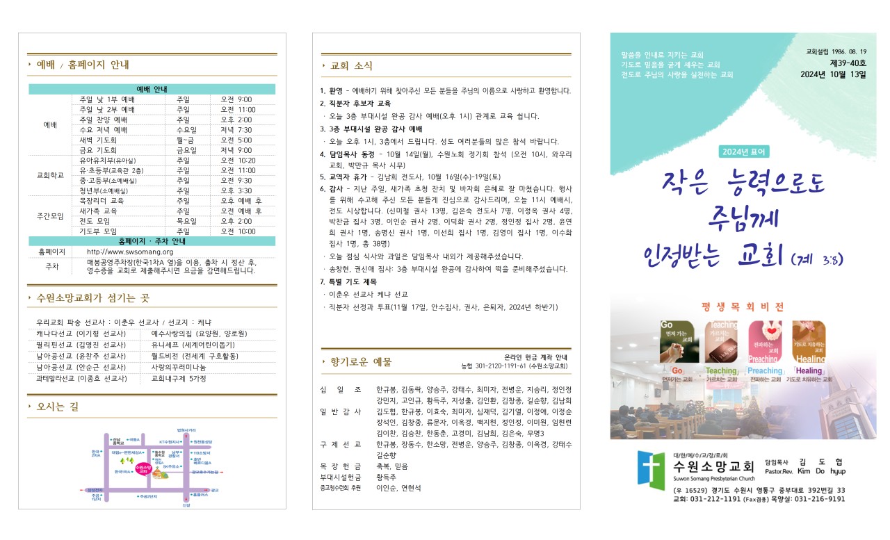 4. 담임목사 동정 - 10월 14일(월), 수원노회 정기회 참석 (오전 10시, 와우리 교회, 박만규 목사 시무)