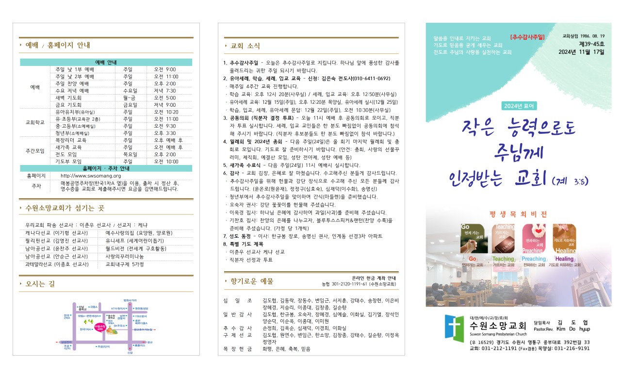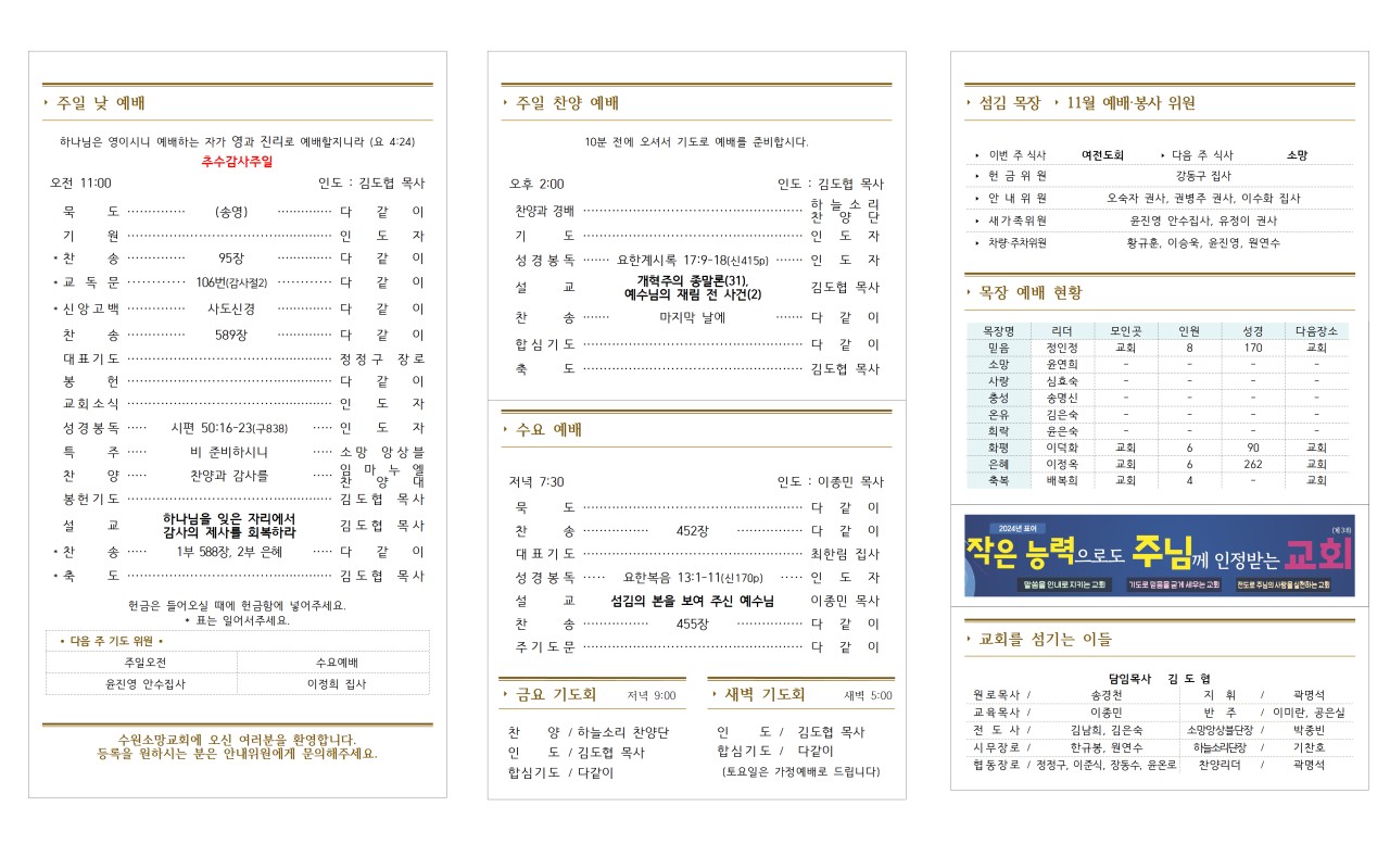 기도로 잘 준비하시기 바랍니다. (안건: 총회, 사랑의 선물꾸러미, 제직회, 예결산 모임, 성탄 전야제, 성탄 예배 등)