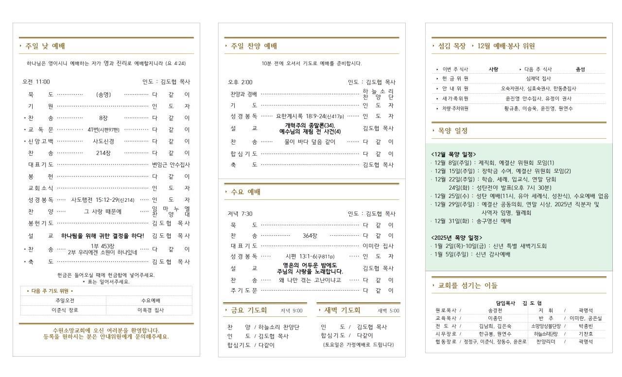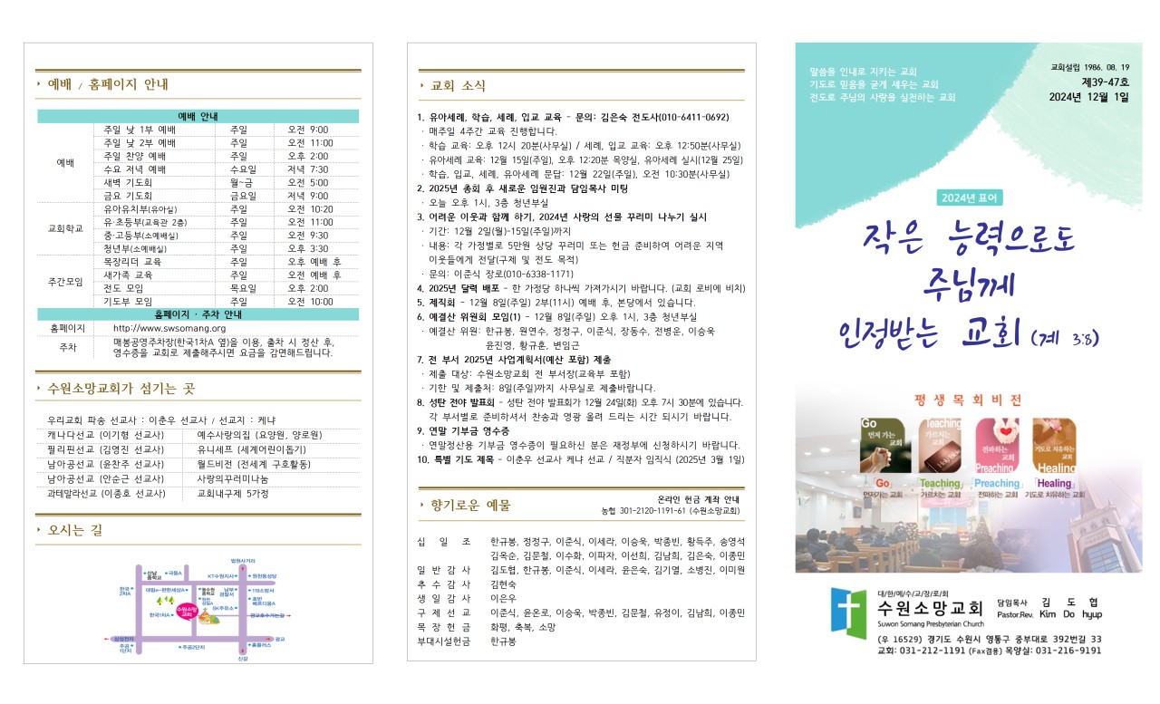 · 유아세례 교육: 12월 15일(주일), 오후 12:20분 목양실, 유아세례 실시(12월 25일)