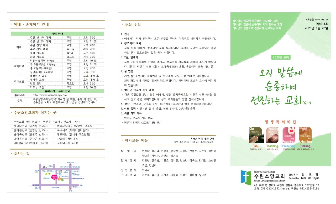 · 다음 주일(2월 2일), 오후 예배시, 일본 도메국제교회 박민규 선교사님을 모시고 선교 관련 예배드립니다. 성도 여러분들의 많은 참석바랍니다.