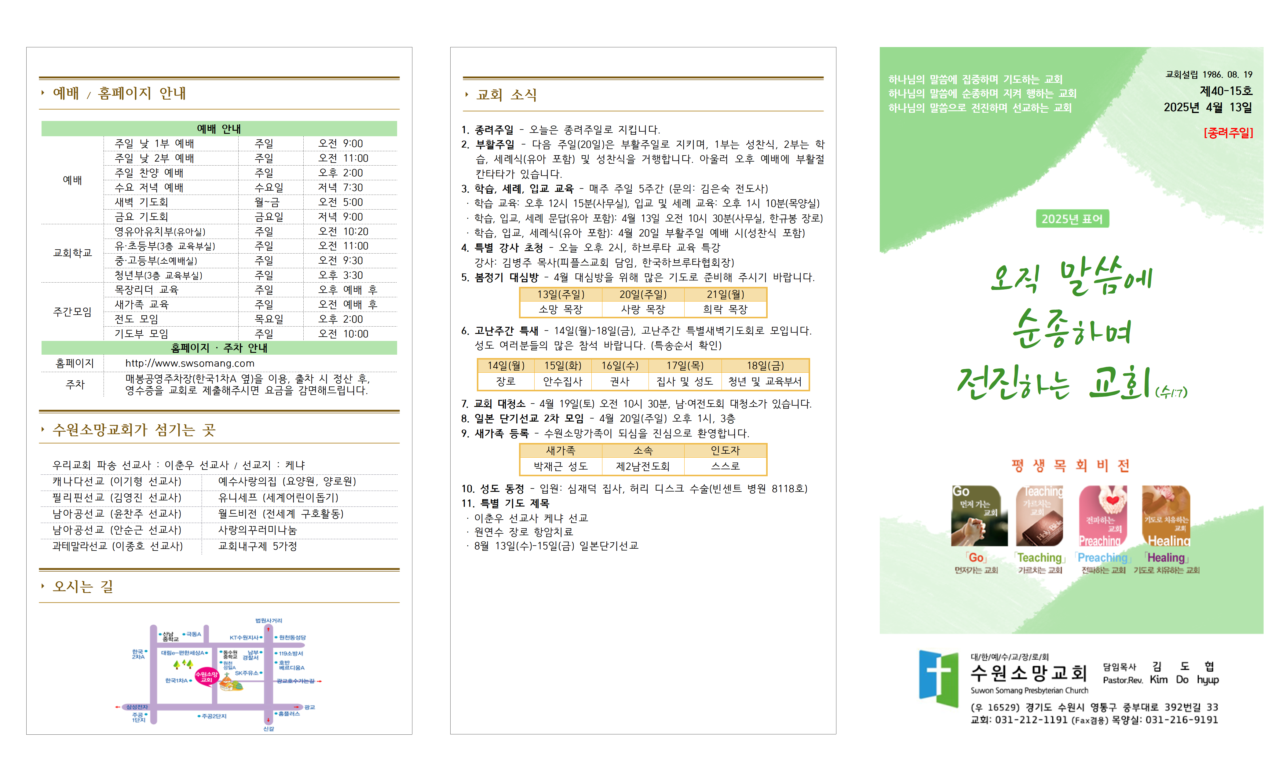 2. 부활주일 - 다음 주일(20일)은 부활주일로 지키며, 1부는 성찬식, 2부는 학습, 세례식(유아 포함) 및 성찬식을 거행합니다. 아울러 오후 예배에 부활절 칸타타가 있습니다.