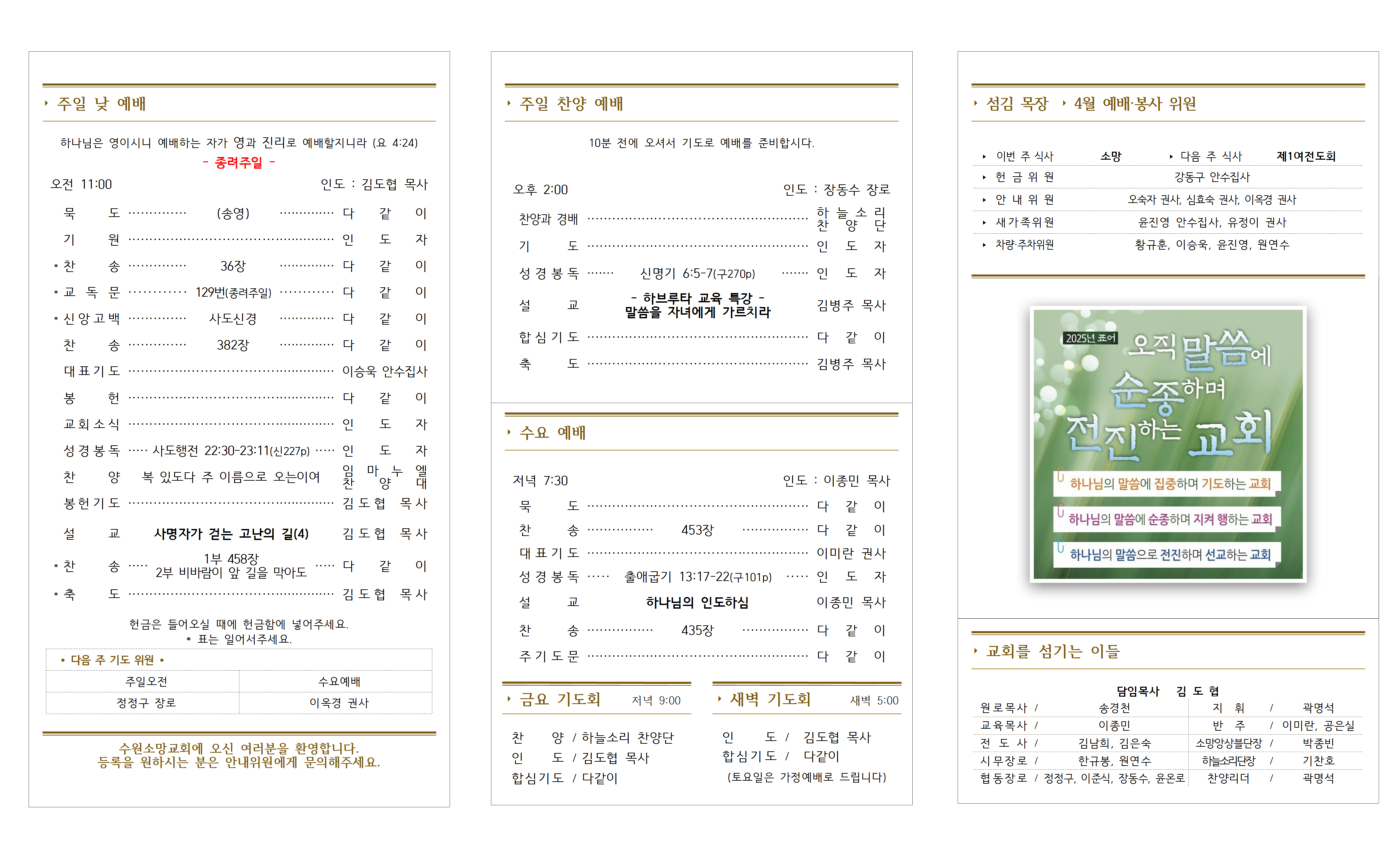· 학습 교육: 오후 12시 15분(사무실), 입교 및 세례 교육: 오후 1시 10분(목양실)