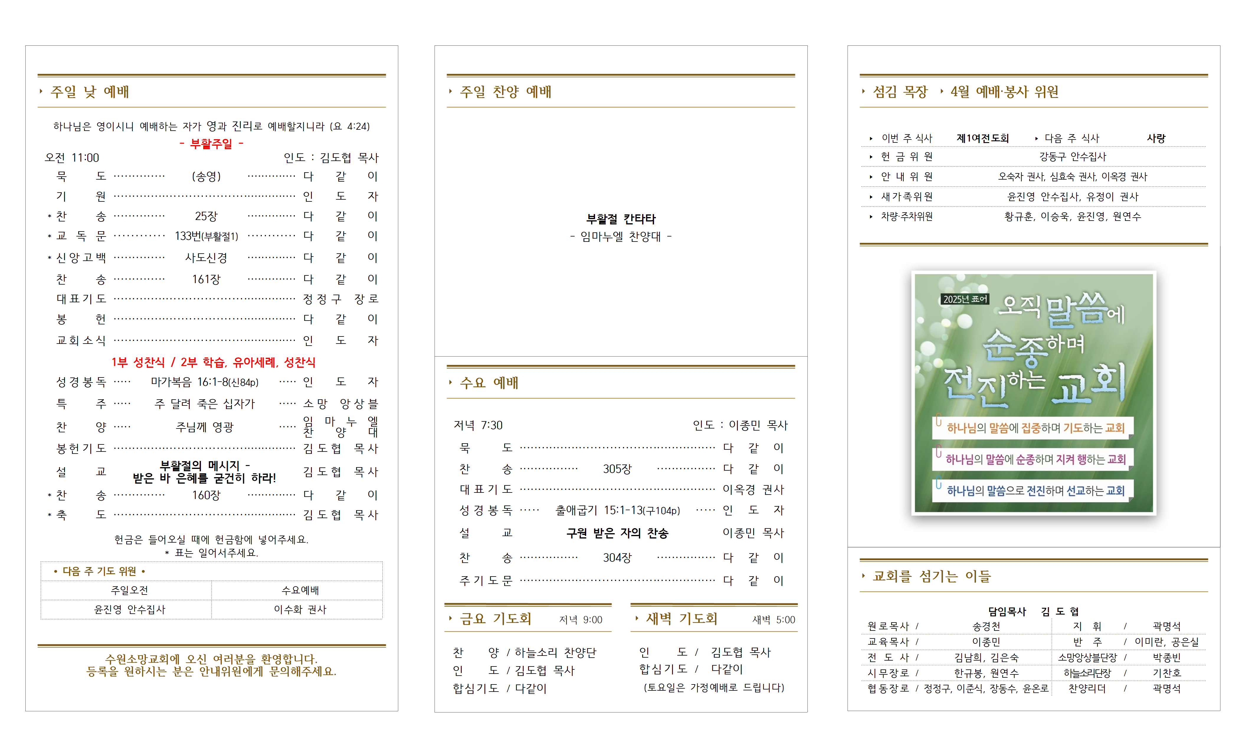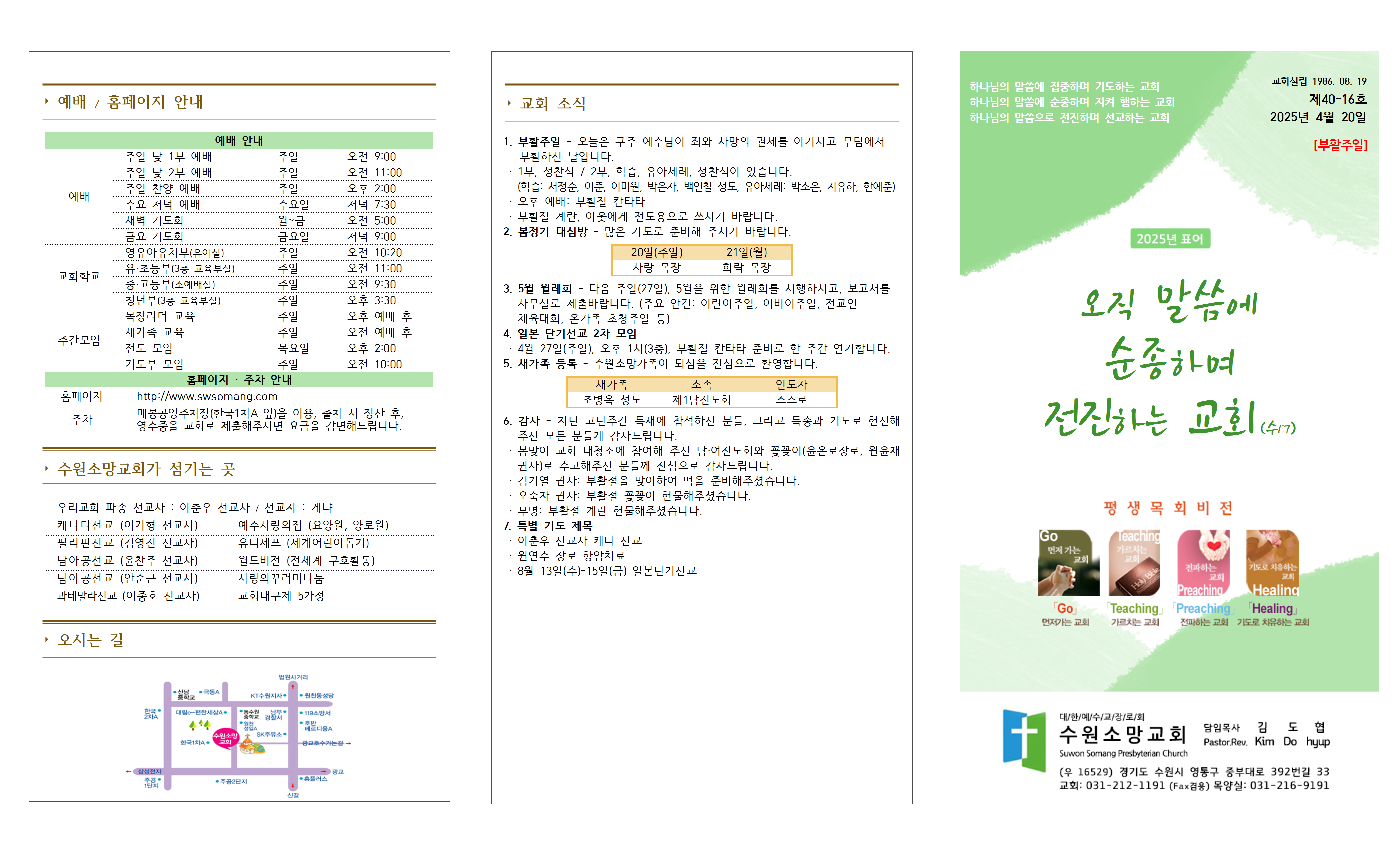 · 봄맞이 교회 대청소에 참여해 주신 남·여전도회와 꽃꽂이(윤온로장로, 원윤재권사)로 수고해주신 분들께 진심으로 감사드립니다.
