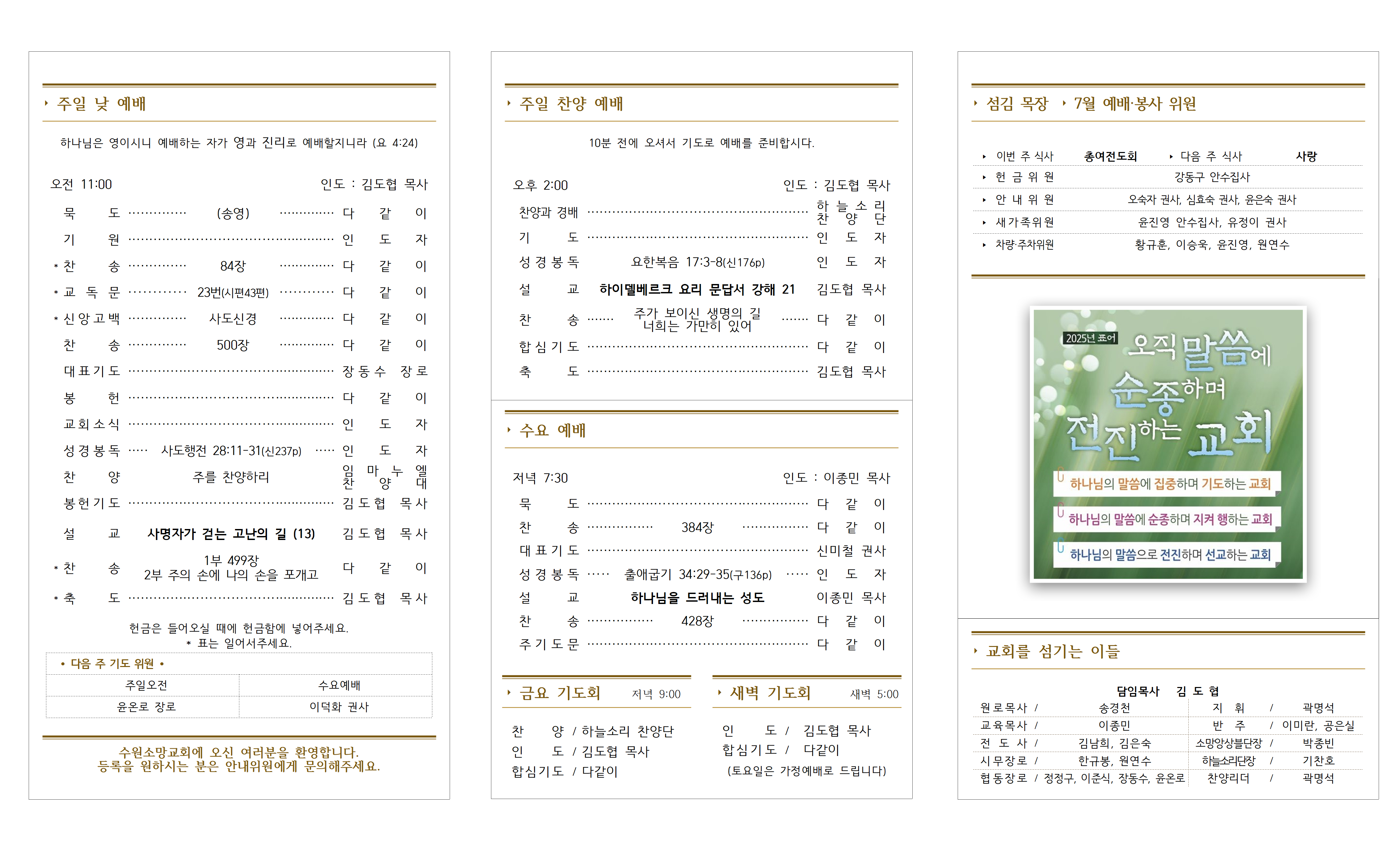 · 전 성도님들은 공예배에 꼭 참석하시고, 은혜의 자리를 사모하시기 바랍니다.