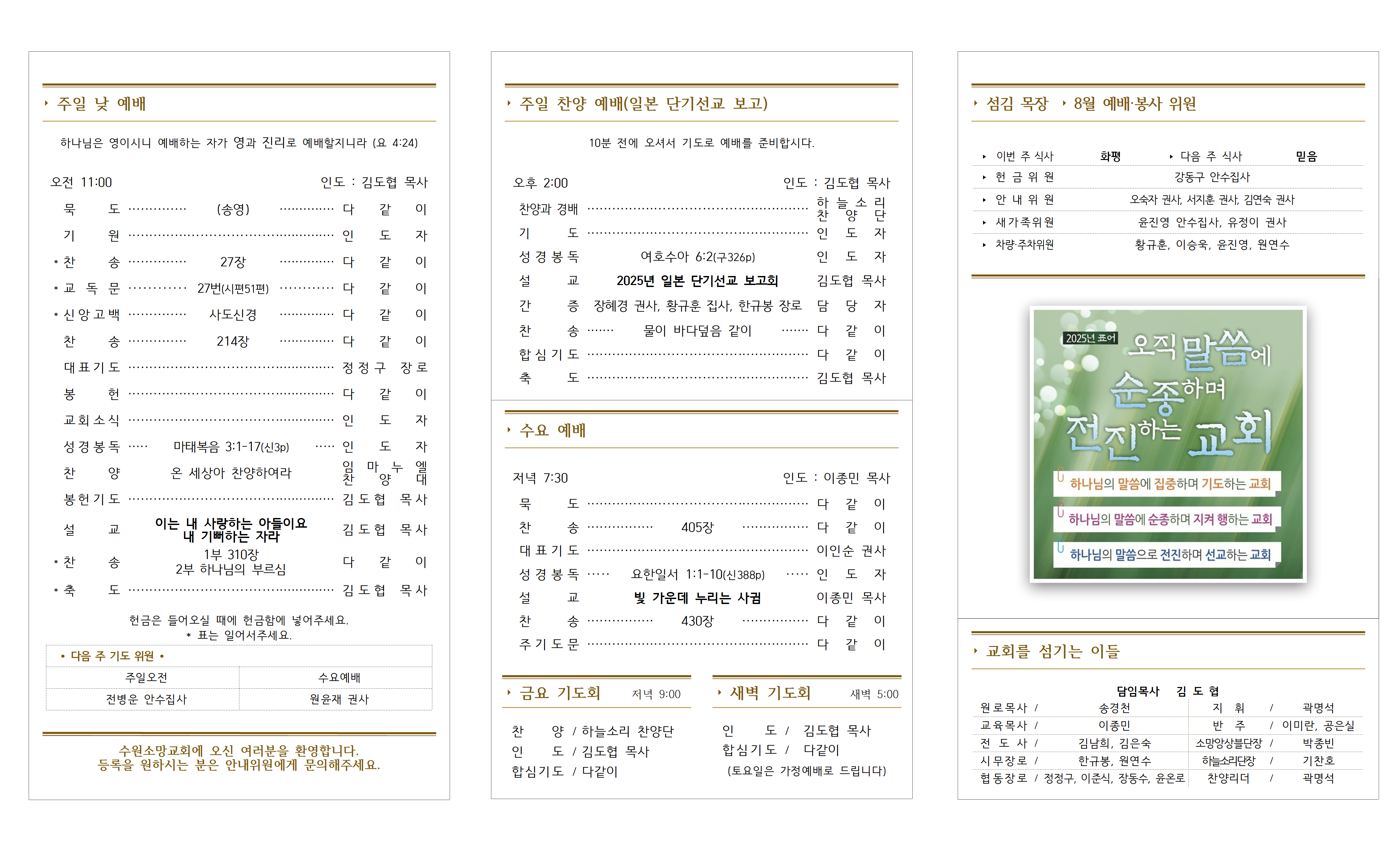 4. 수원노회 임시노회 - 8월 21일(목) 오후 2시, 수원북부교회(김경덕 목사 시무)에서 임시노회가 있습니다(담임목사 참석). 성도님들의 많은 기도 바랍니다.