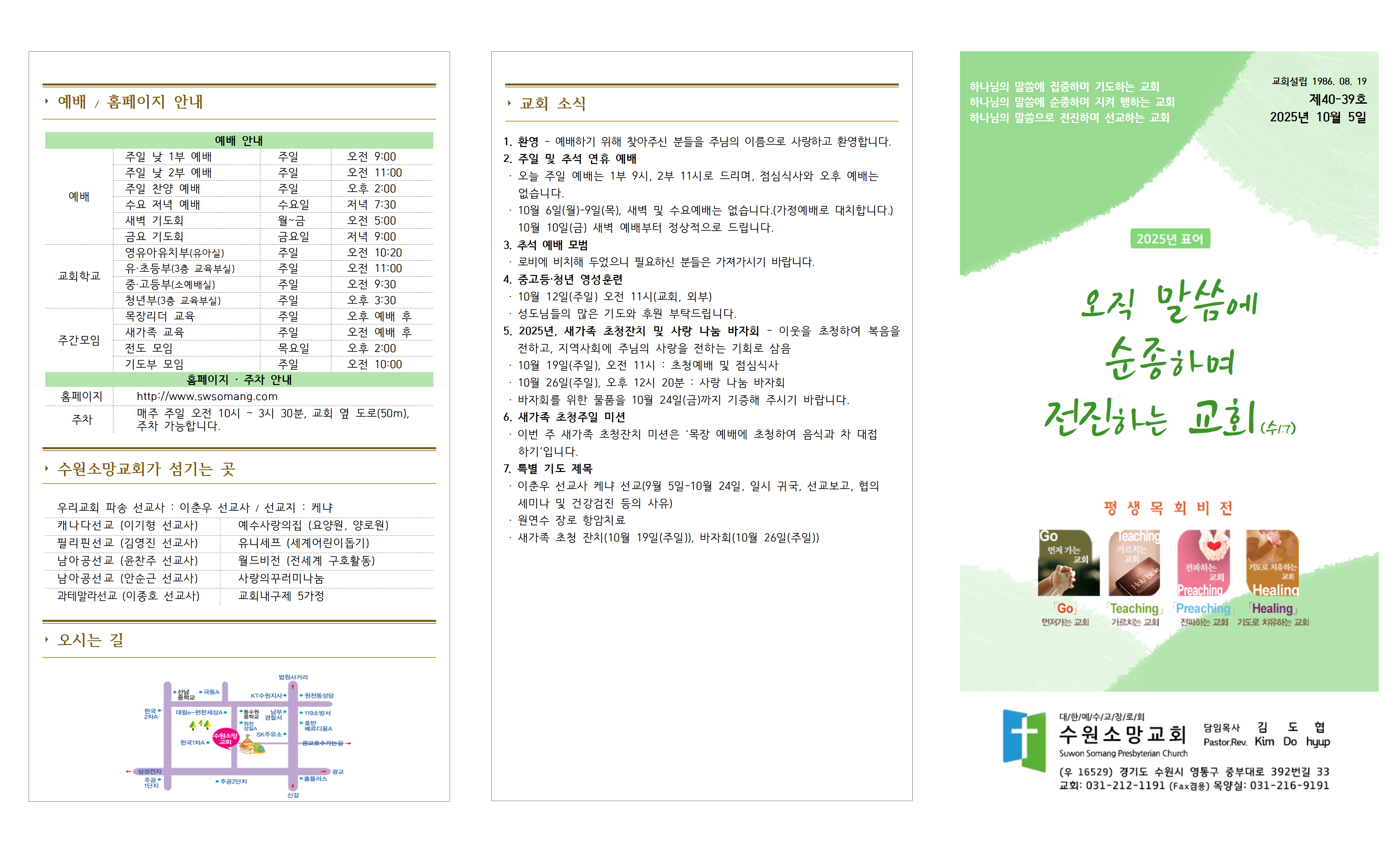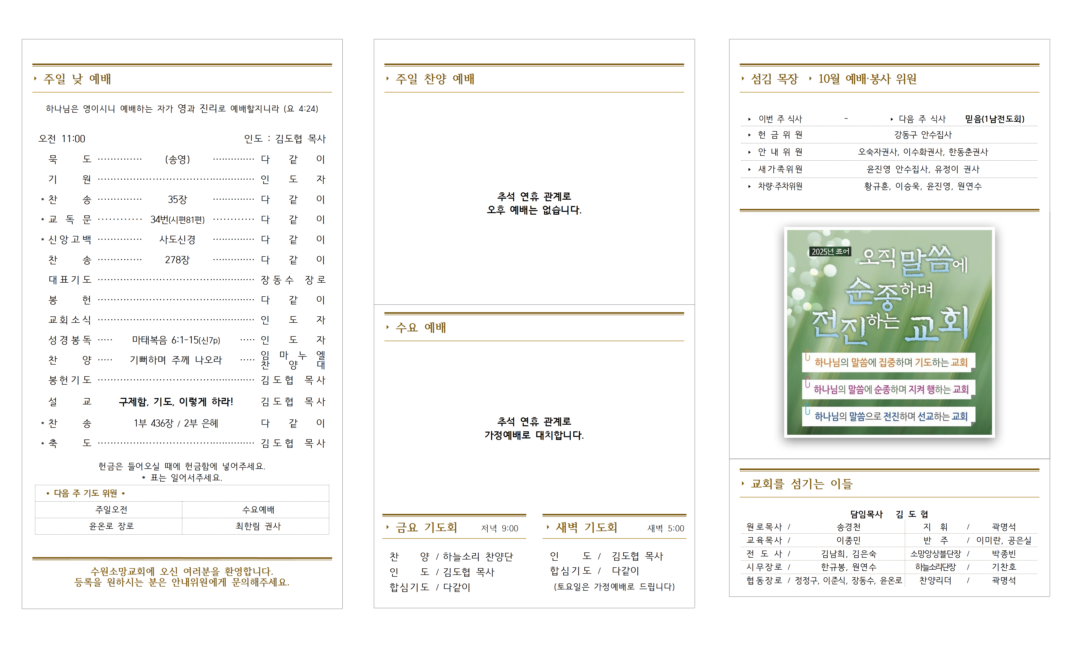 · 10월 6일(월)-9일(목), 새벽 및 수요예배는 없습니다.(가정예배로 대치합니다.)