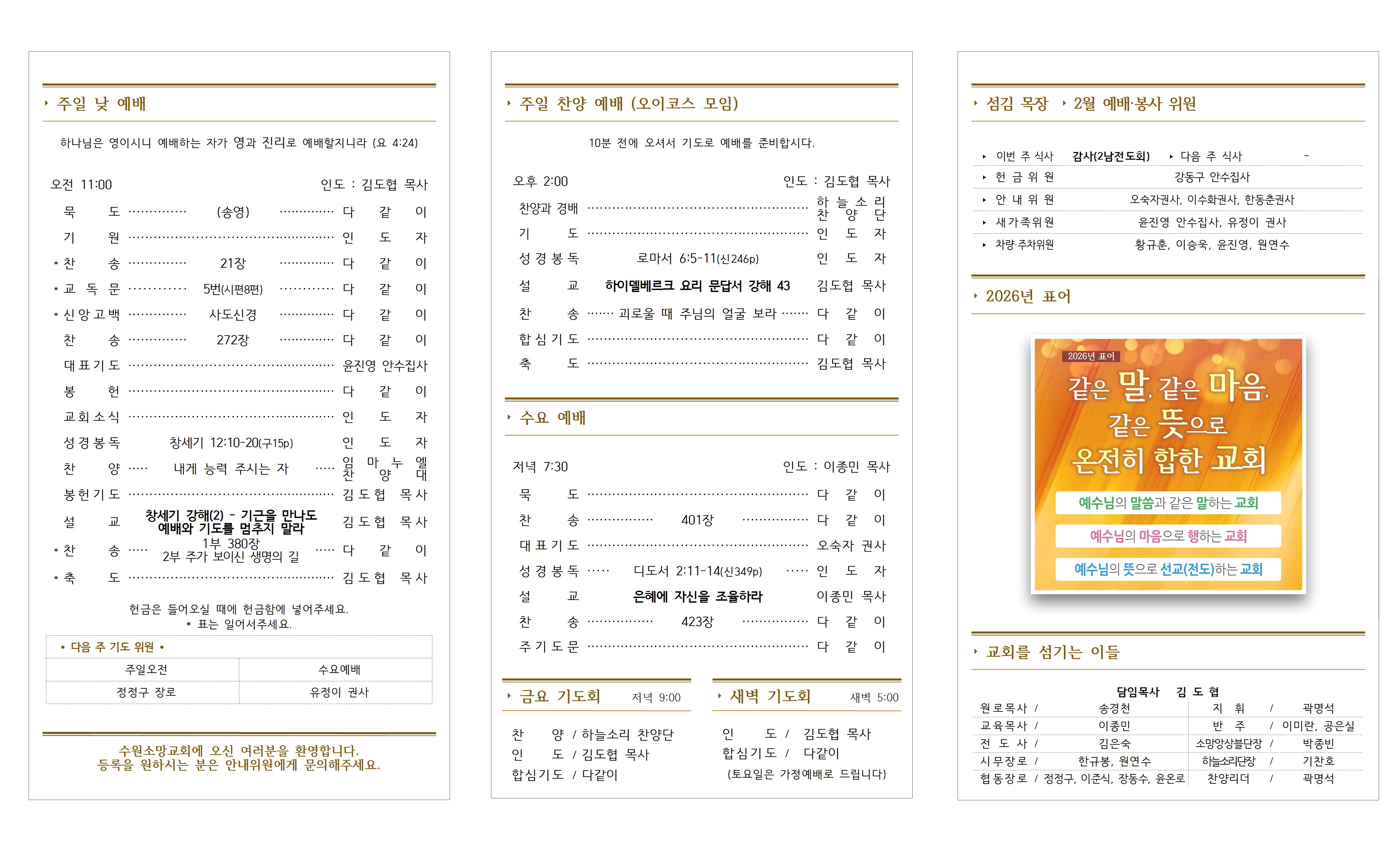 · 다음 주일(2월 15일) 예배는 1부 9시, 2부 11시로 드리며, 점심식사와 오후 예배는 없습니다.