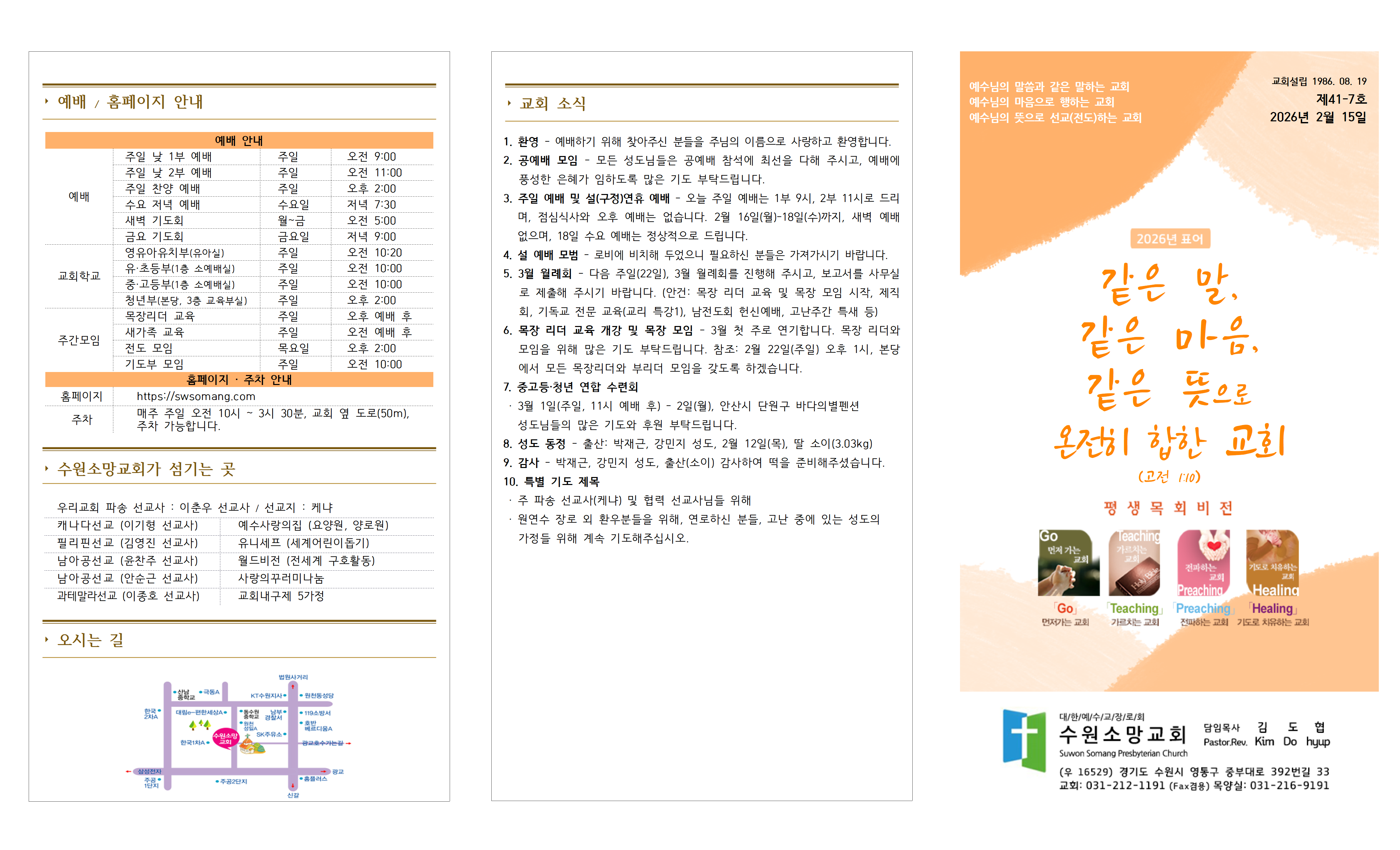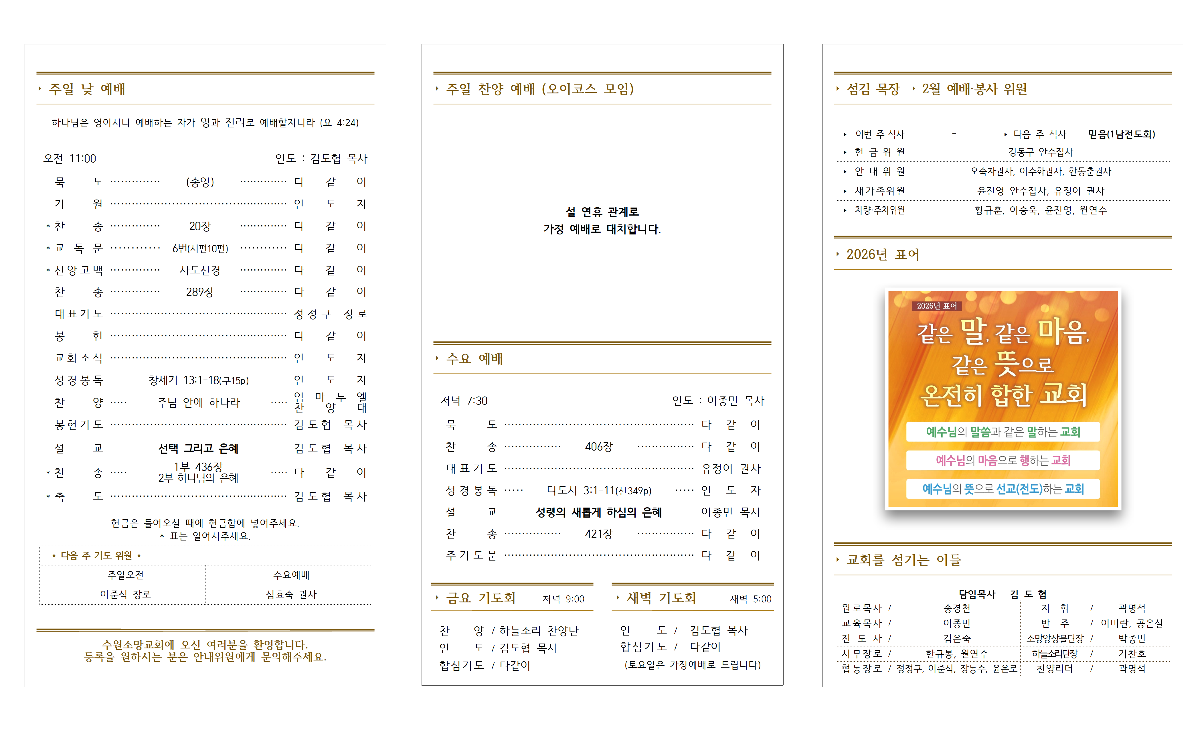 3. 주일 예배 및 설(구정)연휴 예배 - 오늘 주일 예배는 1부 9시, 2부 11시로 드리며, 점심식사와 오후 예배는 없습니다. 2월 16일(월)-18일(수)까지, 새벽 예배 없으며, 18일 수요 예배는 정상적으로 드립니다.