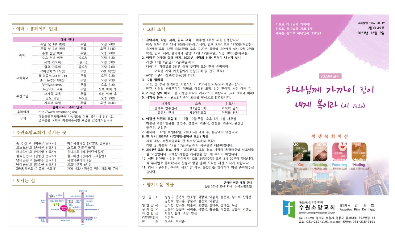 · 2024년도 교회 청소 사역에 동참해주실 성도님들을 모집합니다. 자세한 사항은 게시판을 참고해 주시기 바랍니다.