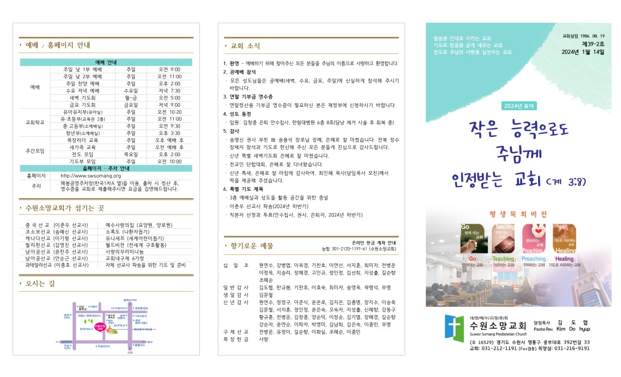 · 모든 성도님들은 공예배(새벽, 수요, 금요, 주일)에 신실하게 참석해 주시기 바랍니다.