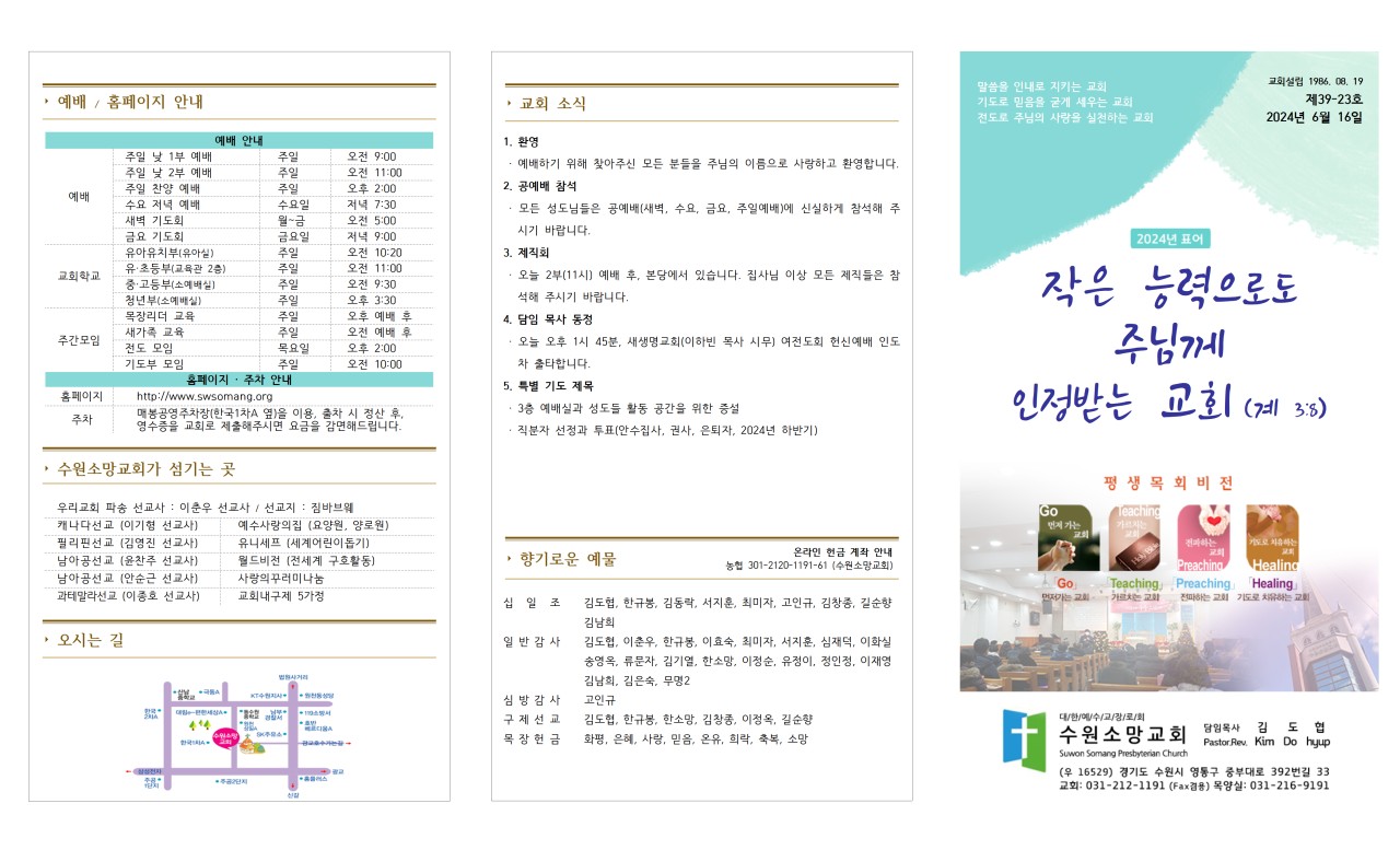 · 모든 성도님들은 공예배(새벽, 수요, 금요, 주일예배)에 신실하게 참석해 주시기 바랍니다.