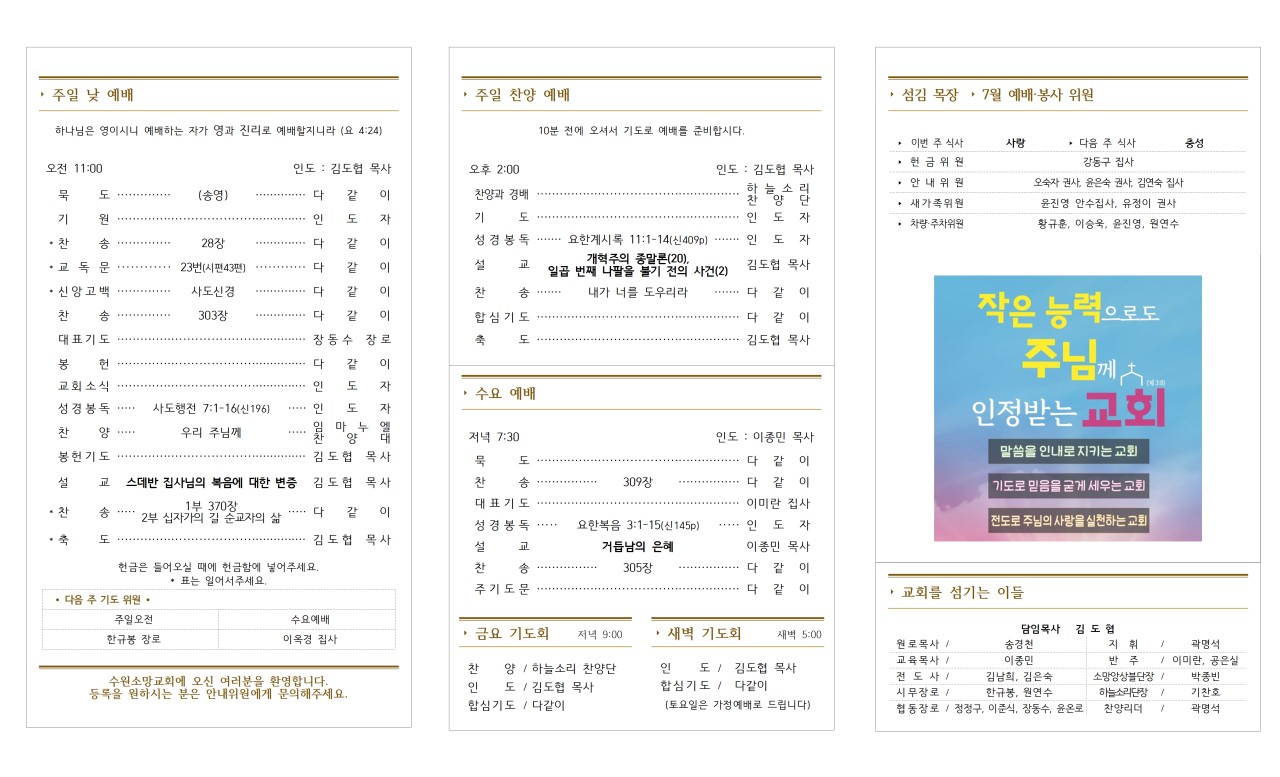· 8월 첫째 주일(4일)부터 새로운 직분자 후보분들의 교육 실시합니다.
